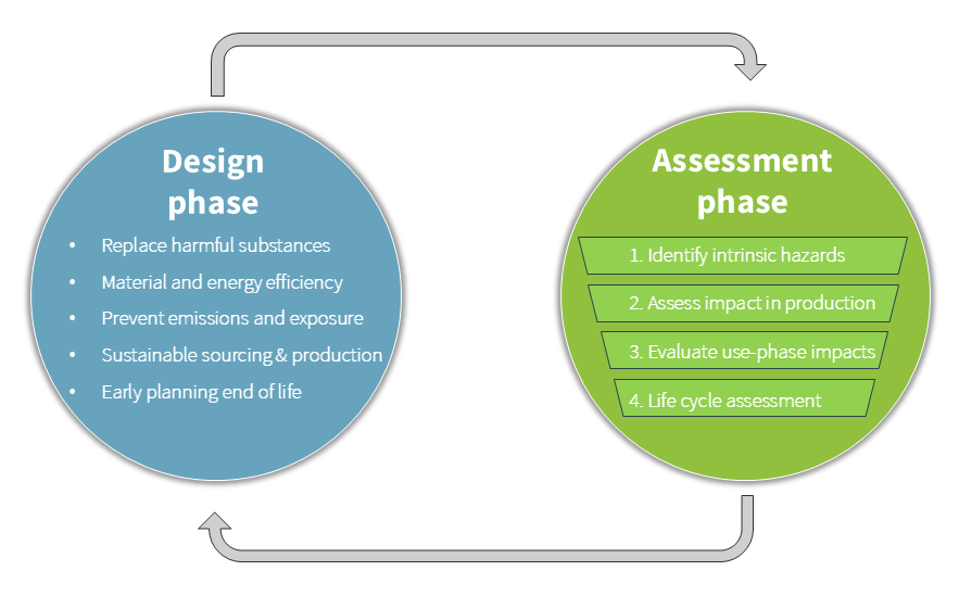 Guided by green chemistry, green engineering, and circular design principles, this phase focuses on principles such as: